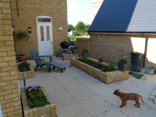 Now we've reached the far side of the garden and have turned around to look over the water feature back towards the gate to the drive. From here you get a sense of the two levels ... the upper patio, lined by herb beds, has doors into our laundry room and sitting room.